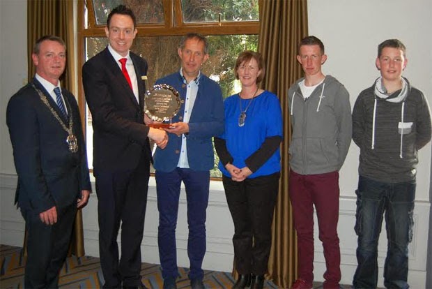 | John receiving the award from Patrick Shields, Manager, Midleton Park Hotel. Also pictured are Deputy Lord Mayor, Cllr Fergal Dennehy, along with Siobhan, Eoin and Darragh Cashman |