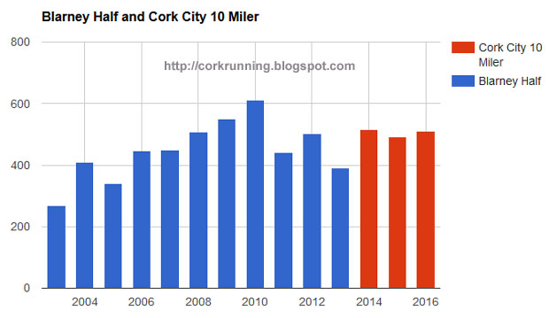 So the answer to the original query is that the numbers are actually up when compared to 2011-2013. It's down on the 2010 peak in Blarney but still pretty good. Comparing the three years of the 10 miler from 2014-2016 to the half from 2011-2013 then the move into Cork City was a success.