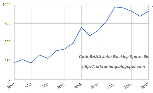 There were a total of 914 finishers in this years Cork BHAA John Buckley Sports 5k road race in Cork City, a jump of 8% on last years numbers. As you can see from the chart above, the numbers have been gradually declining for three years since 2013 so this year is a reversal of that trend.
