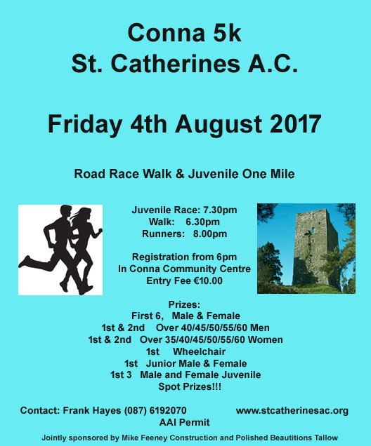 Organised by St.Catherine's Athletic Club, this 5 km road race is coming up in the village of Conna on Friday, the 4th of August 2017.