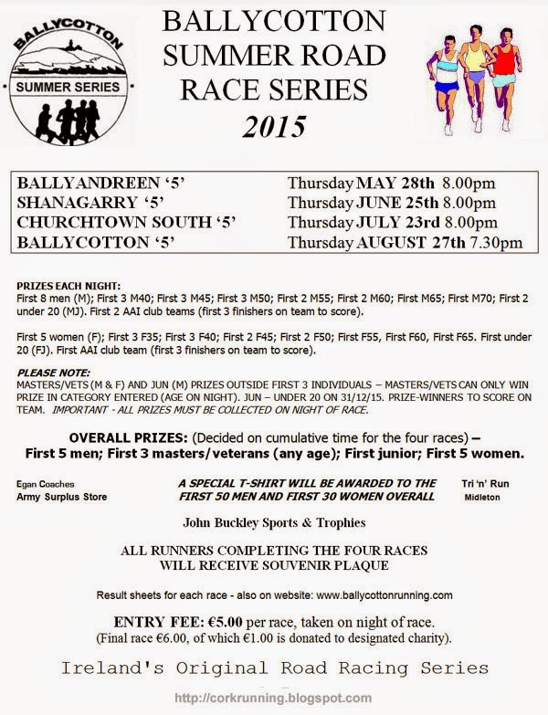 The Ballycotton Summer Series is the oldest road race series in the country and it's hugely popular every year. The dates and times are always the same...4th Thursday of every month from May to August....Starts at 8pm except for the last one which is 7:30pm. The top 50 men and top 30 women in the series get finishers t-shirts.